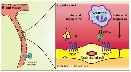 Spinal cord injury (SCI) can induce a chronic wound state that undergoes expansion and maintains demyelination associated with an impaired recovery and progressive degeneration accompanied by maladaptive inflammation, and macrophage activation [75]. A preliminary study showed that TSP-1 activation of CD47 induced apoptosis using a caspase-dependent and -independent mechanism in cultivated cerebral cortical neurons and NB4 cells [76]. Moreover, TSP-1-mediated activation of CD47 increased cytotoxicity in CNS-derived EC cultures, although the alteration in the proliferation of the ECs was not evaluated [76]. Similarly, Myers et al. [7] demonstrated that CD47 bound to TSP-1 inhibits angiogenesis and that CD47 binding to SIRPα facilitated neutrophil diapedesis through ECs to the injured areas in a mice model. In the same study, functional improvements were not observed in TSP-1−/− mice when compared to wild-type mice, although CD47−/− mice exhibited greater locomotor development and sparing of white matter following contusive SCI. Moreover, the deletion of either CD47 or TSP-1 enhanced vascularity in the acute epicenter of contused mice, while the deletion of CD47 alone reduced neutrophil diapedesis and enhanced microvascular perfusion. Lastly, using an ex-vivo model of the CNS microvasculature, it was shown that CD47−/− derived microvessels (MVs) significantly exhibited adherent wild-type or CD47−/− neutrophils on the endothelial lumen, while the wild-type-derived MVs did not. Such a condition reflects a deficiency in diapedesis, which is mediated by the loss of CD47 expression on the ECs. Interestingly, in-vitro transmigration assays have demonstrated the contribution of SIRPα to neutrophil diapedesis via the EC monolayer [7]. These results suggest that CD47 partly improves the functional recovery from SCI by enhancing vascular patency and decreasing SIRPα-mediated neutrophil diapedesis rather than abolishing TSP-1-mediated antiangiogenic signaling (Figure 3).