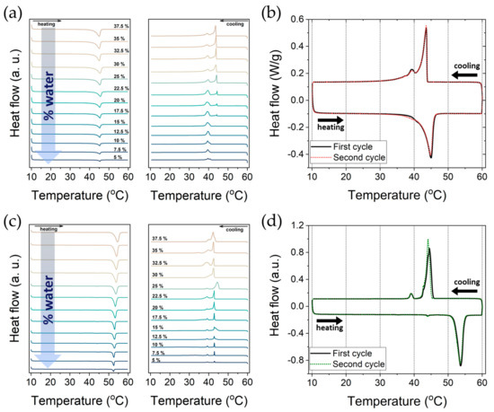 Thermal analysis under heating and cooling of two double-chain cationic surfactants. Thermograms from 5 to 37.5 wt% of (a) DODAC and (c) DODAB in water. Two-cycle thermograms under heating and cooling of (b) 35 wt% DODAC and (d) 25 wt% DODAB in water. The full line corresponds to the first cycle and the dotted line to the second cycle. The measurements were conducted from 10 to 60 °C, and back to 10 °C at 2 °C/min. The endothermic event corresponds to the downwards deflection.