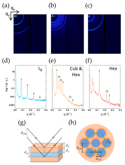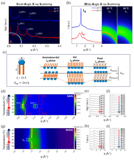 Structural parameters of the lamellar phase, such as the bilayer volume fraction (Φbi), the area per surfactant molecule (a) and the bilayer thickness (dbi), were calculated from the SAXS and WAXS results, using Equation (1) and Equation (2) [35]