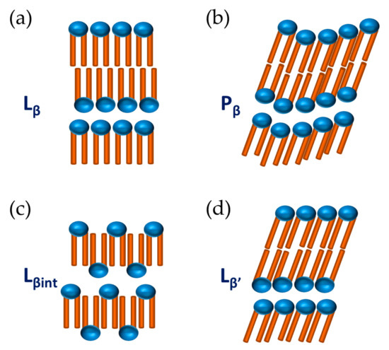 In literature, it is possible to find a number of suggested deviations from the ideal behaviour of Figure 2c, namely rippled (Pβ), tilted (Lβ’) and interdigitated (Lβint) gel phases [23,31,32,33]; see Figure 3. By investigating the changes in the SAXS spacing data on dilution with water, some insight into the structure can be obtained.
