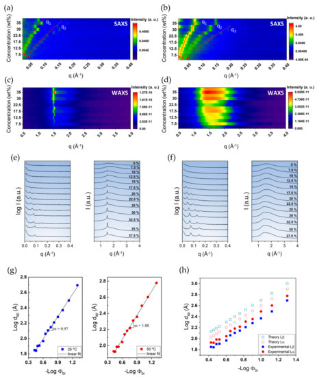 The swelling behaviour of DODAC in water, especially for surfactant concentrations that display a single and stable phase (>33 wt% [34]) down to a rather low surfactant concentration of 5 wt%, was investigated. The small and wide-angle X-ray scattering patterns collected at one temperature below and one above the Tm, i.e., at 25 °C and 50 °C, are presented in Figure 4.