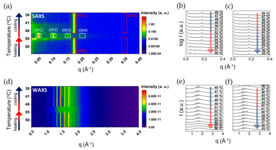 Small- and wide-angle X-ray scattering characterisation of 25 wt% DODAB in water. (a) 2D image and corresponding (b,c) 1D SAXS patterns and (d) 2D image and corresponding (e,f) 1D WAXS patterns during a heating and cooling ramp from 40 to 58 °C and back to 35 °C.