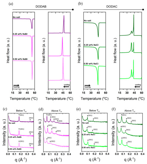 Thermal and packing characterisation of 35 wt% DODAB and 35 wt% DODAC in the presence of electrolytes. (a,c,d) DODAB in the presence of 0.25 wt% (0.08 M) and 0.50 wt% (0.16 M) of NaBr; (b,e,f) DODAC in the presence of 0.25 wt% (0.09 M) and 0.50 wt% (0.19 M) of NaCl. SAXS patterns were collected below (25 °C) and above (65 °C) the Tm.