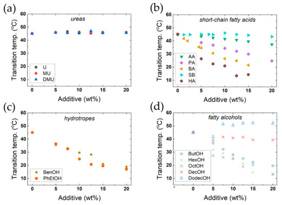 Figure 9 shows the effect of the 15 additives on the main thermal transition under heating. As seen in Figure 9a, urea and two simple urea derivatives have no significant effect on the transition temperature, even up to high concentrations. Furthermore, they do not affect the enthalpy of the thermal transition (Table S2). These compounds also do not significantly affect the X-ray diffraction patterns; thus, the bilayer thickness and the area per surfactant molecule in the bilayer are the same as in the absence of additive. Thus, replacing water with urea and these two urea derivatives seems to have no appreciable effect on interactions between the surfactant molecules. We note that for more weakly associating systems, which are on the balance of association, urea is well-known to have significant effects, such as the micelle formation of relatively polar surfactants, or the self-assembly of DNA (into the double helix) or cellulose [12,48,49,50,51,52,53,54,55,56,57].