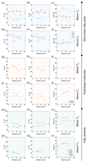 For the other additives studied, the situation is different – several additives caused major changes in the main transition temperature (Figure 9 and Table S2) and packing (Figure 10). Alcohols and fatty acids are known to have large effects on the self-assembly of ionic surfactants, with quantitative differences depending on the polarity of the additive. A highly polar compound is located mainly in the aqueous region due to high solubility, and this will change the solvent character, leading to weakened hydrophobic interactions – therefore, in this case, the CMC will increase. For an alcohol or fatty acid with a longer alkyl chain, a completely different pattern is observed; these compounds have a lower aqueous solubility, and will be located in the non-polar parts of the aggregates. Thus, the CMC is markedly decreased, and furthermore, major changes in surfactant packing, leading to changes in the aggregates, are observed. Therefore, these additives may induce changes from spherical micelles to thread-like ones or hexagonal or lamellar liquid crystalline phases at higher additive concentrations.