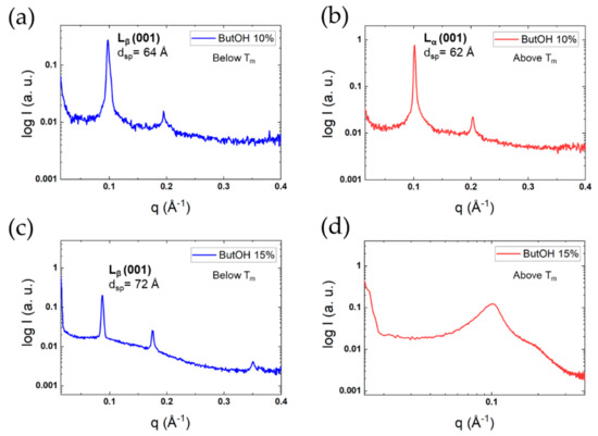 SAXS patterns for DODAC in the presence of butanol. Top panels: 10.0 wt% of the additive: (a) below the Tm, and (b) above the Tm. Bottom panels: 15.0 wt% of the additive: (c) below the Tm (10 °C) and (d) above the Tm.