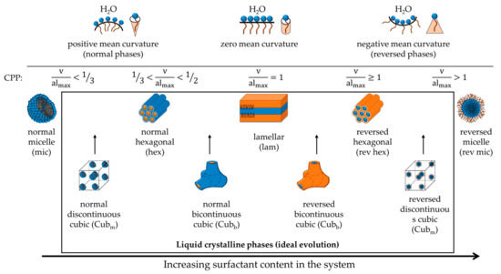 Representation of the surfactant self-assembly evolution at different values of the critical packing parameter (CPP) and the geometrical constraints. The CPP relates the head group area (a), the extended length (lmax) and the volume (v) of the hydrophobic part of a surfactant molecule. The box highlights the various liquid crystalline phases.