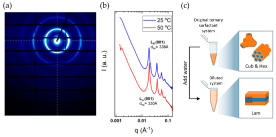 SAXS analysis of diluted (10 times) 35 wt% DODAC-12.5 wt% Octanol in water. (a) 2D scattering pattern at 50 °C and (b) corresponding 1D integrated pattern at 25 °C and 50 °C. (c) Scheme of the phase evolution on dilution with water.