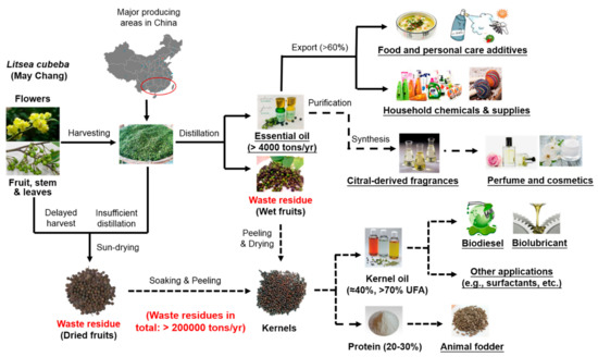 The depletion of fossil energy and the unprecedented global climate change force people to eagerly seek raw materials for the available biomass, responding to the demand of sustainable energy supply [2,3]. In recent years, with the rapid development of society and the increasing demand for a better life, some local woody oil plants in China like Camellia oleifera have gradually attracted more and more attention in both domestic and foreign markets due to their unique chemical compositions and functional properties [4]. Besides this, Litsea cubeba was found as an emerging woody oil plant resource that can be implemented in a total valorization toward a zero-waste biorefinery, resulting in various plant-based products with added value for different application fields.