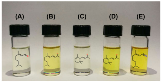 Citral-derived fragrances from Litsea cubeba (LC) essential oils: (A) purified LC essential oils; (B) pseudoionone; (C) α-ionone; (D) β-ionone; (E) lemonile.