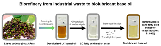 Traditional lubricating oils derived from non-renewable mineral raw materials are poorly biodegradable, which are likely to have a serious impact on ecological balance. In contrast, plant oil-based lubricants can be biodegraded quickly and completely with low ecotoxicity [129]. Therefore, the development of ecofriendly biolubricating oils has attracted more attention. According to the ASTM (American Society for Testing and Materials) test, plant oils from rapeseed, soybean, sunflower, and palm with long-chain fatty acids can be used as bio-based raw materials, which can ensure good lubricity and low environmental impact. Nevertheless, using these oils as feedstock may lead to competition with food supply and poor oxidative stability of biolubricant base oils. Recently, Litsea cubeba kernel oil demonstrated itself as a promising medium-chain saturated fatty acid feedstock for biolubricant-based oil synthesis [130]. The fatty acid methyl ester (FAME) of Litsea cubeba kernel was prepared through decolorization, glycolysis, and methanolysis, which was then transesterified with trimethylolpropane (TMP) to produce trimethylolpropane fatty acid trimester (TFATE) under optimal conditions (Figure 3). The purified TFATE product could achieve good oxidative stability and low-temperature performance qualified by ISO VG 32 standard.