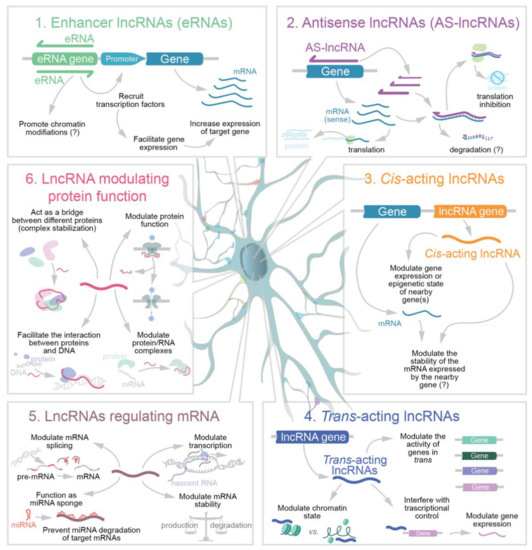 Among the numerous possible classifications for lncRNAs proposed [55,56,57,58,59,60,61], here we decided to divide brain lncRNAs in six main functional classes. These include: (1) Enhancer lncRNAs (eRNAs), which are the product of bidirectional DNA transcription taking place in the region of active enhancers [62]; (2) Antisense lncRNAs (AS-lncRNAs; also known as natural antisense transcripts) produced by antisense transcription of a protein-coding sequence which can be degraded following the formation of double strand RNAs [63]; (3) Cis-acting nuclear lncRNAs, thus acting in the same genome locus from which they originate and that interfere with and/or regulate the transcription of neighboring genes [64]; (4) Trans-acting nuclear lncRNAs involved in epigenetic regulation; (5) LncRNAs that modulate gene expression by post transcriptional mechanisms and affect mRNA stability, translation, or splicing [65,66,67] and finally (6) LncRNAs directly modulating protein functions that are generally functioning in association with RNA binding proteins (RBPs), in some cases also outside the nucleus. This classification is summarized in Figure 1.