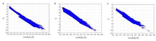 Correlation of the complementarity factor (fc) and the sum of the distances (sumRLRE): (a)—7D4F (suramin complex), (b)—7CTT (favipiravir-RTP complex), (c)—7AAP (favipiravir-RTP complex).