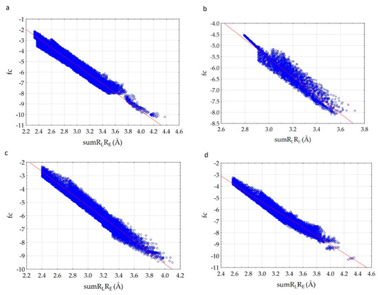 Correlation of complementarity factor (fc) with the sum of the distances (sumRLRE): 7CTT enzyme—favipiravir-RTP (a), 7AAP enzyme—favipiravir-RTP (b), 7CTT RNA—favipiravir-RTP (c), 7AAP RNA—favipiravir-RTP (d).