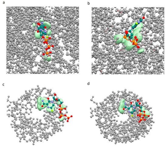 Complementary field of complexes 7CTT and 7AAP: 7AAP enzyme—favipiravir-RTP (a), 7CTT enzyme—favipiravir-RTP (b), 7AAP RNA—favipiravir-RTP (c), 7CTT RNA—favipiravir-RTP (d) (grey—enzyme (a,b) and RNA (c,d), light green—complementary field).