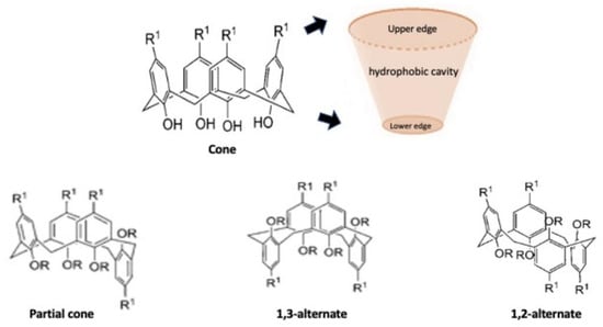 Calixarene is a macrocyclic molecule, that together with cyclodextrins, nanotubes, nanoparticles, micelles and corona ethers, represents the third generation of supramolecular compounds. Supramolecular chemistry is a discipline that studies self-assembly and reversible interactions of host–guest complexes for the construction of intelligent vehicles for drug delivery. These are intermolecular bonds, where species are linked together by non-covalent supramolecular interactions, including van der Waals forces, hydrophobic bonds, hydrogen bonding, metal-coordination and host–guest interactions. These interactions improve the stability of nanocarriers in biological fluids and optimize circulation time and transport performance. Despite having weak interactions, they are able to optimally bind the guests, making the structure more flexible and protecting the complex from small perturbations while maintaining the reversibility of the self-assembled structure [25]. These compounds can include appropriately selected drugs within them and can also be structurally modified to increase their affinity for a particular host [26]. This class of molecules was extensively studied for drug delivery because they present a variable conformation that makes them excellent drug carriers (Figure 1) [27].