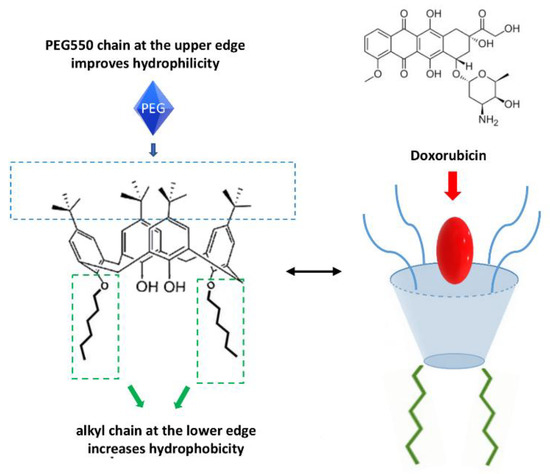 By making structural changes to the calixarene molecule, it is possible to improve its biological and carrier activity. In particular, some researchers have introduced an alkyl chain that increases hydrophobicity and a PEG550 chain at the upper edge which improves hydrophilicity [58]. This amphiphilic structure allows the self-assembly of DOX, while the addition of folic acid improves the selectivity towards cancer cells because they are characterized by an overexpression of folate receptor (Figure 2).