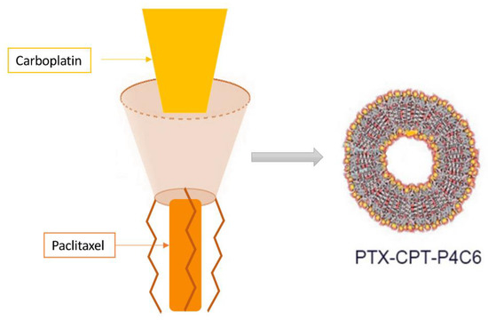 Carboplatin is often used in anticancer therapy in combination with paclitaxel. The combination of these two anticancer drugs mediates a synergistic effect and reduces carboplatin-resistance, but at the same time increases toxicity [73]. For this purpose, nanoparticles of amphiphilic calixarene phosphonates capable of hosting both carboplatin and paclitaxel have been synthesized (Figure 3).