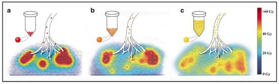- Walrand, S.; Hesse, M.; Chiesa, C.; Lhommel, R.; Jamar, F. The low hepatic toxicity per Gray of 90Y glass microspheres is linked to their transport in the arterial tree favoring a nonuniform trapping as observed in posttherapy PET imaging. J. Nucl. Med. 2014, 55, 135–140. [Google Scholar] [CrossRef][Green Version]