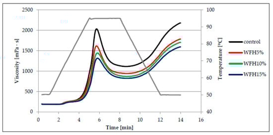 The main component of flour responsible for the pasting process is starch. When starch is heated in hydrothermal conditions, the starch grains absorb water, swell, and then break, as a result of which amylose flows from their interior and the formation of a colloidal solution. The continuous phase of such a solution is water-soluble amylose. As a result of cooling such a system, an increase in viscosity is observed as a result of the formation of a three-dimensional network consisting of chains of amylose and amylopectin linked by hydrogen bonds, which is characterized by the ability to retain water [15,17,20]. Viscosity changes the analyzed systems of wheat flour with the addition of hazelnuts and walnuts in various proportions are illustrated in the form of the so-called pasting curves (Figure 1 and Figure 2). On the basis of their course, it can be stated that the addition of nuts had statistically significant influence on the pasting characteristics of the analyzed systems. The control sample, i.e., without the addition of nuts, had the highest peak, and thus the highest maximum viscosity. On the other hand, the presence of ground nuts in the system resulted in a significant reduction of the peak height and the reduction of the maximum viscosity value. The change was the greater with the greater the proportion of nuts was in the analyzed systems (Figure 1 and Figure 2). This may be due to the lower proportion of starch in systems with more ground nuts. Moreover, the course of the pasting curves indicates that replacing flour with walnuts (W) in the mixtures resulted in a greater reduction in maximum viscosity in comparison with hazelnuts (H). The viscosity peak is a measure of the free-swelling capacity of starch grains [20].