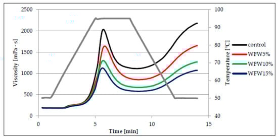 The pasting characteristics of 5% suspensions of the tested systems were performed using the RVA viscosity analyzer (Rapid Visco Analyzer, Tec Master, Perten Instruments, Sweden). Samples (all the time mixed at 160 rpm/min) were kept at 50 °C for 1 min, then heated to 95 °C at a rate of 12 °C/min, further kept at 95 °C for 5 min, cooled down to temperature of 50 °C at a rate of 12 °C/min and finally kept at 50 °C for 2 min. The following parameters were read from the obtained viscograms: pasting temperature (PT) (°C), maximum viscosity during heating (PV) (mPa·s), viscosity at 95 °C (HPV) (mPa·s), final viscosity at 50 °C (FV) (mPa·s), decrease in viscosity during heating, value: PV-HPV (BD) (mPa·s), increase in viscosity during cooling, value: FV-HPV (SB) (mPa·s). The determination was made in triplicate.