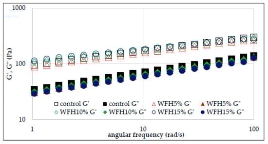 The WFH15% system was characterized by the highest value of this parameter. In the case of systems with the addition of hazelnuts, the K′ value increased along with the increasing addition of H to the flour. The opposite situation was observed in the case of systems containing W, as in this case the value of K′ decreased with the increasing share of W in the system. Thus, the mean K′ value of WFW systems was 78.2 and was lower than the control sample and the mean of the WFH system by 24% and 32%, respectively. The two-way analysis of variance showed a statistically significant influence of the type of nuts, the amount of their addition and the interaction between the type of nuts and the amount of their addition to wheat flour (p < 0.001) on the value of the K″ parameter reflecting the initial value of G″ modulus. The value of the K″ parameter ranged from 18.9 (WFW15%) to 34.7 (control). The presence of nuts in the analyzed systems reduced the value of the described parameter. Moreover, in the case of both types of nuts, their increasing share in the system resulted in a decrease in the value of the K″ parameter. As a result of the statistical analysis, a significant negative linear correlation was found between the values of the K″ parameter and the temperature values characteristic for the pasting process TO and TE (r = −0.86, r = −0.87, p < 0.05 respectively), as well as a positive correlation with the parameters of the PV, HPV, FV, and SB pasting process (r = 0.81, r = 0.96, r = 0.97, r = 0.98, p < 0.05, respectively). A slight statistical differentiation among all analyzed gels was found for the values of the parameters n′ and n″ reflecting the sensitivity of the modules to changes in angular frequency.