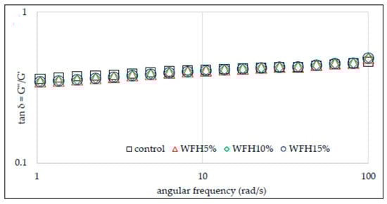 The rheological properties of flour–nut systems were also analyzed by the small deformation rheology method with the use of an oscillating rheometer. The viscoelastic properties of the material result from the presence of certain structures capable of partially storing energy, which is partially recovered when the stress is released. However, at the same time, a large part of the same energy is irretrievably lost after the applied stress is released. Hence the conclusion that such materials are characterized by both elastic and viscous features. The use of an oscillating rheometer allows you to track changes in the value of conservative and loss moduli depending on temperature and frequency [19]. Thus, the conservation modulus (G′) describes the share of elastic properties in the analyzed material and corresponds to that part of the energy that is stored. In turn, the loss modulus (G″) characterizes part of the energy lost or scattered during sinusoidal deformation. The ratio of energy lost to stored, in each cycle, is described as tan δ, which otherwise informs about the physical behavior of the system [17,18,19]. Figure 3 and Figure 4 show the sweep frequency curves of systems with the addition of hazelnuts and walnuts, and Figure 5 and Figure 6 show changes in the tangent value of the phase shift angle with respect to the angular velocity for the analyzed systems. The values of the G′ and G″ modules depend on the amylose content in starch granules, the presence of non-starch components and the swelling capacity of the starch and its crystallinity.