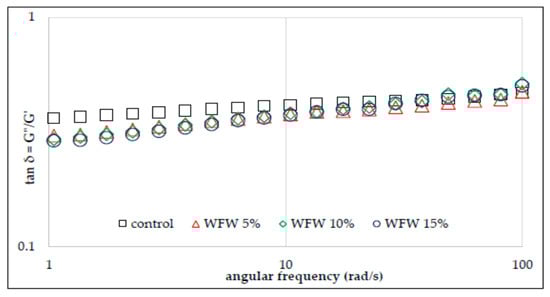 Tangent δ depending on the angular frequency of wheat flour gel and samples with walnuts addition.