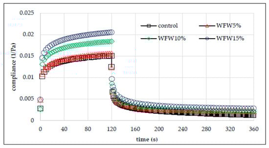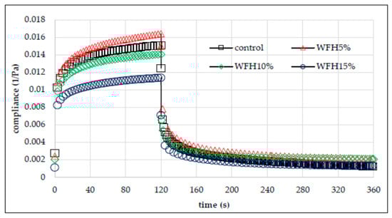 The evaluation of the rheological properties of the analyzed wheat flour–nut systems also included a test describing the susceptibility of the system to deformation over time. The creep test measures the deformation of a material under applied stress. After it subsides, the degree of structural reconstruction is also measured using the recovery test [29,30]. Creep and recovery phenomenon is related to the temporary reorientation of chemical bonds that build the viscoelastic structure in the material. The temporary susceptibility of the bond orientation in an elastic material is related to the applied stress, which, however, disappears as soon as it wears off. In turn, the characteristics of the viscoelasticity of the material result from the disturbance and conversion of chemical bonds [30,31]. Figure 7 and Figure 8 show exemplary creep and recovery plots of the analyzed systems.