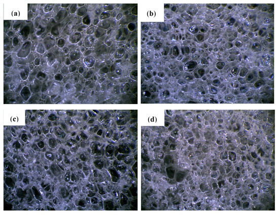 Cell size distribution and foam morphology were examined based on the cellular structure pictures of foams taken using JEOL JSM-5500 LV scanning electron microscopy (JEOL LTD, Akishima, Japan). The microscopic research was carried out in a high-vacuum mode and at the accelerating voltage of 10 kV.