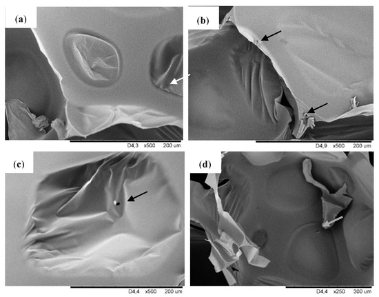 Figure 2 shows the SEM pictures taken at a higher magnification, where the filler particles dispersed in the pores of modified foams can be observed. The filler particles can exist both in the cell struts as well as inside the pores. It is visible that for modified foams particles are attached to the cell wall and cell struts which is visible for foam PUR-POSS-Ar-Et-Cl and PUR-POSS-Pr-Cl. In contrast, in the case of foam PUR-POSS-Ar-Cl, filler particles are observed in the void cell space.