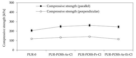 To determine the mechanical properties of the PUR foam, the compressive strength at 10% deformation was tested. Since in rigid PUR foams there is anisotropy of cells manifested by cell elongation in the direction of foam growth, the samples were tested in two directions: parallel and perpendicular to the direction of foam growth (Figure 3). By analyzing the data from the diagram, it can be seen that the addition of POSS-Cl has a significant effect on increasing the compressive strength of PUR. The PUR-0 foam showed a compressive strength parallel to the direction of the foam growth of 207 kPa, while for modified foams there is a tendency to increase the mechanical strength to even 262 kPa for PUR-POSS-Pr-Cl. This 25% increase in strength was due to the higher foam density resulting from the introduction of the POSS cage structure. For other modified foams, a positive effect on strength parameters is also visible. Much lower strengths were obtained in the case of measurements carried out in the direction perpendicular to the direction of foam growth. But also in this case, the introduction of POSS-Cl improved the compressive strength. Only a slight deterioration was noted for PUR-POSS-Ar-Et-Cl, which could be due to the fact that this foam was characterized by the most heterogeneous structure.