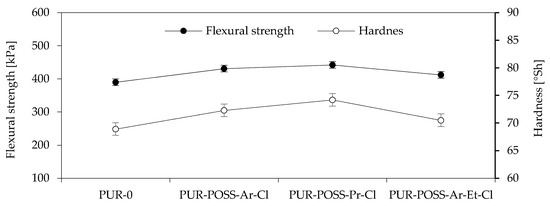 The obtained results of the highest bending stress transmitted by the sample (δfm), called the flexural strength, are shown in Figure 4. Based on the results, it can be seen that the addition of POSS-Cl also significantly changed the flexural strength of the foams obtained. For all modified foams, an increase in the value of the maximum bending stress transferred by the sample was observed. The PUR-POSS-Pr-Cl series is characterized by the highest bending resistance, for which δfm is equal to 442 kPa. This result is higher by almost 15% compared to PUR-0. A very similar tendency can be seen in the case of foam hardness results. The increase in hardness was also caused by the higher density of the samples, although the standard deviation for these results was quite large, which resulted from the heterogeneity of the structure and the large dispersion of the obtained results. Therefore, it should be remembered that the addition of modifiers disrupts the cellular structure, which may cause deterioration of mechanical properties; therefore, it is important to properly select the amount of the introduced modifier.
