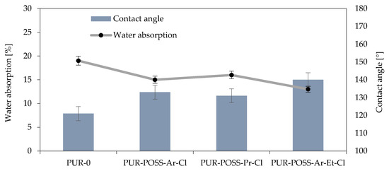 The presence of Cl in the POSS particle resulted in its low surface energy, which could translate into a reduction in the hydrophobicity of the entire system [38]. Therefore, the water absorption and contact angle of the foams’ surfaces were measured for the samples (Figure 5). These parameters are important from the operational point of view because it is important that insulation materials made of PUR do not show a tendency to absorb water or moisture from the environment, which could change their general performance parameters and lead to faster degradation.