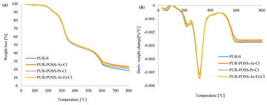 The determination of char residue by TGA is a relative method of assessing the fire resistance of a polymer [41]. The foams containing the addition of modifiers showed a higher percentage of carbonation residues than the reference foam, where at 800 °C PUR-POSS-Ar-Cl, PUR-POSS-Pr-Cl and PUR-POSS-Ar-Et-Cl the carbon content increased, respectively, up to 23.2, 20.8 and 22.4% compared to 18.6% for the PUR-0 reference sample. It can be concluded that POSS-Cl can act as a charring agent, which positively influences not only the thermal stability, but also the fire resistance of PUR foams. All these observations may indicate the effect of POSS additives on increasing thermal stability.