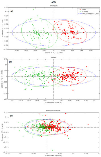 In the next step, principal component analysis was applied to examine the possibility of separating male and female teeth spectra on a PCA score-score graph. The results for tooth apex and anatomical neck are presented in Figure 2 and Figure 3, respectively, and the PCA scores were calculated separately for tooth spectra of molars and premolars. There is a strong separation between male and female spectra in Figure 2a,b and Figure 3a,b, mostly due to the PC 1 scores. On the other side, when spectra of molars and premolars are combined (Figure 2c and Figure 3c), the ability of PCA to distinguish between female and male spectra is significantly reduced, especially for spectra recorded on the apex. The presented PCA results indicate that detecting gender using the Raman spectroscopy is possible only with the comparison of spectra recorded at the same site on the tooth (apex, anatomical neck) and using the same type of tooth (molar, premolar).