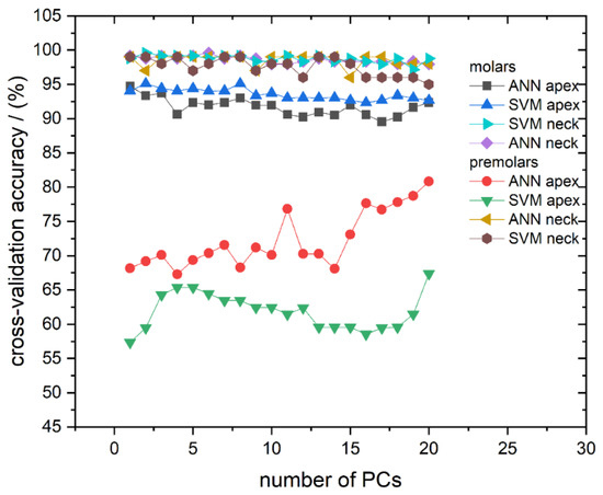 We first address the cross-validation classification results. The classification success rate in the models with a different number of used PCs, for all calculated models, is presented in Figure 4. The cross-validation confusion matrix of the most successful classification models, for spectra recorded on molar and premolar apex obtained by SVM and ANN, respectively, is presented in Table 2. As can be seen in Figure 4, it is evident that most of the computed models have validation accuracy higher than 90%. The exceptions are the models calculated from spectra recorded from apex on premolars, which predominantly have accuracy well below 75%.