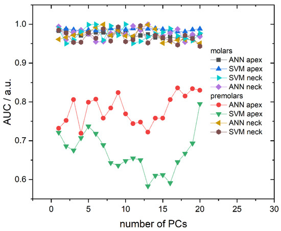 It is also important to note the high consistency of the results obtained using the models calculated with both applied algorithms. This consistency excludes the possibility of overfitting and confirms the quality of the used methodology. The dependence of AUC on tooth type is also in accordance with the obtained results for classification accuracy. Namely, higher AUC values are obtained for molars compared to premolars and ANN again proves to be superior to SVM. AUC values for molars are close to 1 and 0.9 for ANN and SVM, respectively, while for premolars, AUC values are lower for both ANN and SVM.