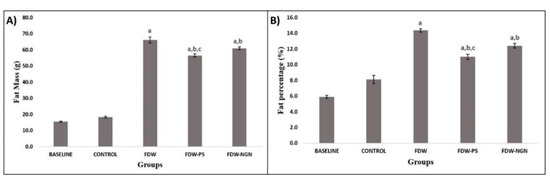 | Food intake (g/day) | 15.23 ± 0.54 | 20.91 ± 0.67 a | 18.15 ± 0.51 a,b | 17.55 ± 0.53 a,b |