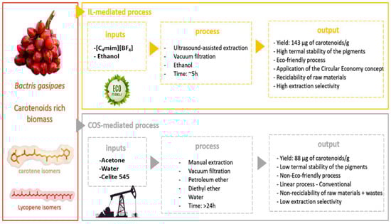 Schematic representation of the extraction processes evaluated in this study. The IL-mediated process is considered an eco-friendly method; and the COS-mediated process, based on organic solvents derived from petroleum.