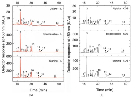 Chromatograms obtained by HPLC-PDA of carotenoid extracts from peach palm fruits via (A) IL xtraction; (B) COS extraction. For both extracts, the chromatograms are of the starting (before in vitro digestion), bioaccessible phase, and uptake samples. Peak 1: 13-cis-β-carotene; Peak2: all-trans-α-carotene; Peak 3: all-trans-β-carotene; Peak 4: cis-δ-carotene (1); Peak 5: cis-δ-carotene (2); Peak 6: cis-δ-carotene (3); Peak 7: all-trans-δ-carotene; Peak 8: cis-γ-carotene (1); Peak 9: all-trans-γ-carotene; Peak 10: cis-γ-carotene (2); Peak 11: cis-γ-carotene (3); Peak 12: 9-cis-lycopene; Peak 13: all-trans-lycopene.