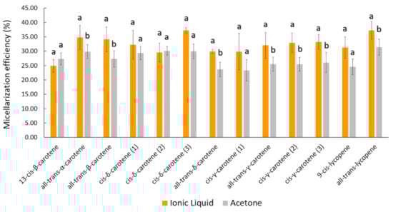 Bioaccessibility of carotenoids from peach palm fruits. Data represent the percentage of carotenoids incorporated into mixed micelles after in vitro digestion. Different letters above each carotenoid bar correspond to a significant difference between the [C4mim][BF4] and acetone extracts. t-test and Dunn test for means comparison were carried out.