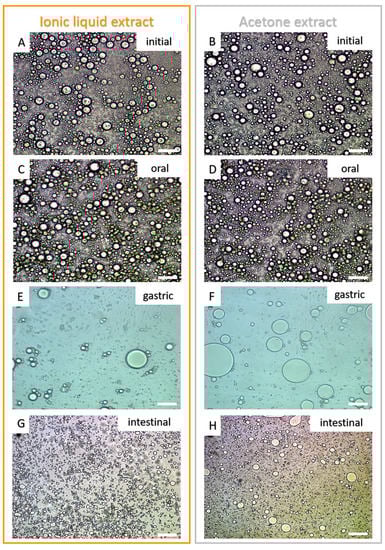As exposed by Salvia-Trujillo et al. (2017) [19], the microstructure of the initial emulsions (before bioaccessibility assay), as well as after the oral, gastric, and intestinal stages, were evaluated by light microscopy (Zeiss Primo Star, Oberkochen, Germany), for both IL and acetone extracts. Subsequently, these images were scanned by an image analysis system (AxionVision—Zeiss), which was utilized for the evaluation of the diameter size of the droplets. A total of 5 images were taken by the group in all stages, and 25 droplets were randomly measured in each image. The results were expressed as mean ± standard deviation of the mean (µm).