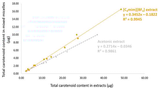 The total carotenoid content in the micelles of the digested samples correlated with the total carotenoid content of the initial samples. Data were analyzed by Pearson’s correlation. Orange points: [C4mim][BF4] extract; gray points: acetone extract.