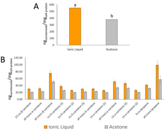 Carotenoid uptake by Caco-2 cells (ngcarotenoids/mgcell protein). Data are related to the ng of carotenoids that were taken from the micellar fraction after 4 h of exposure. (A) Total carotenoids uptake from each extract—Different letters above each bar correspond to a significant difference between the [C4mim][BF4] and acetone extracts (t-test and Dunn test for mean comparisons were carried out); (B) Carotenoids uptake from each compound present in the extracts.