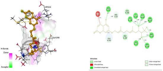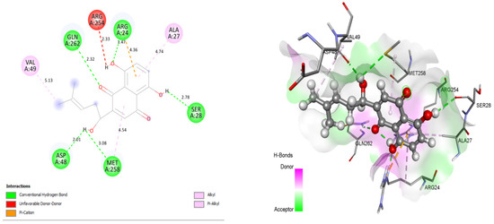 Close intra-molecular interactions formed by Shikonin within the binding pocket of 1AAX include the hydrogen bond formation with ARG24, GLN262, ASP48, MET258, and SER28. Hydrophobic interactions including alkyl and pi-alkyl interaction were formed with residues VAL49, MET258, ARG24, and ALA27, as shown in Figure 2. Common intra-molecular interactions formed by BPPM and Shikonin in the binding pocket of 1AAX revealed the presence of H-bonds with active site residues ARG24, and GLN262, indicating their vital role in forming stable complexes.