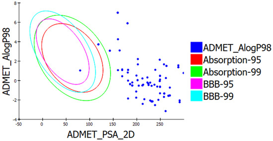 A total of 100 compounds with the best Gold Fitness Score were selected for pharmacokinetic, pharmacodynamic, and drug-likeness analysis. [26]. The ADME descriptors of Shikonin and the top 100 docked compounds were calculated for drug-likeness studies. Pharmacokinetic screening of the top 100 compounds revealed that ZINC31168554 passed Lipinski’s rule of five for oral bioavailability. TheADME model using descriptors 2D PSA and AlogP98 was developed to compute intestinal absorption and blood-brain barrier penetration of the compounds based on 95% and 99% confidence ellipses. The ADME Descriptor screening revealed that ZINC31168554 has 99% confidence levels for human gut and BBB penetration, as shown in Table S1 [26]. Figure 4 shows the plot of the ALogP and polar surface area for the top 100 compounds.