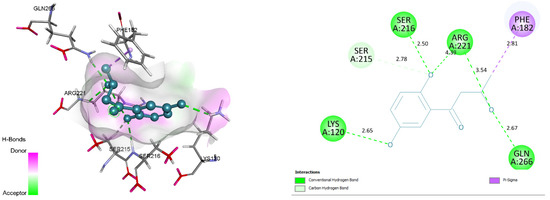 Conserved active site residues forming H-bonds with filtered compounds and the co-crystal ligand BPPM are ARG24, SER215, SER216, ARG221, and ARG254. 3D and 2D docking pose of the filtered compounds on the PTP1B receptor are shown in Figure 5, Figure 6, Figure 7 and Figure 8. The receptor protein (PDB ID: 1AAX) was further investigated for the presence of domain and motifs using ScanProsite and SMART. Two highly conserved domains, ‘TYR_PHOSPHATASE_PTP’ with a score of 52.411 that lies between 3 and 277 residues, and ‘TYR_PHOSPHATASE_2’ domain with a score of 16.141 that lies within 189 to 268 residues are observed in 1AAX. Tyrosine-specific protein phosphatases play an essential role in removing a phosphate group attached to a tyrosine residue to control cell growth, proliferation, differentiation, and transformation. Furthermore, protein tyrosine phosphatases are characterized by the PTP signature motif (I/V)HCXAGXGR(S/T), including two essential residues CYS and ARG, for catalysis [27]. Therefore, all the identified residues forming H-bonds and hydrophobic interactions lie within the conserved domains. In addition, ARG 221 is an essential residue of the PTP signature motif.