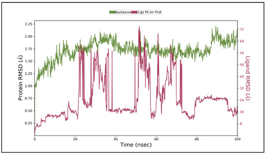 Root means square deviation (RMSD) of protein and ligand after the initial RMSD values were stabilized. This plot shows RMSD values for protein on the left Y-axis, whereas for ligand, these values are indicated on the right Y-axis. The RMSD graph for the backbone is shown in green, and for theligand fit on protein in red.