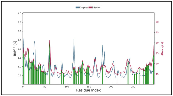 To illustrate the general changes along the protein chain, RMSF was computed throughout the simulation.The peaks in the RMSF plot indicate regions of fluctuation during the simulation, as shown in Figure 10.